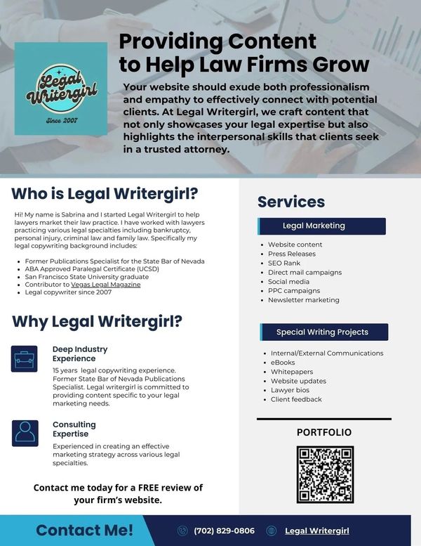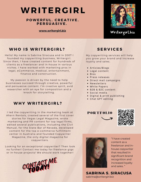 I led the copywriting in the marketing team at Ahern Rentals, created several of the first cover stories for Vegas Legal Magazine, created marketing content for top legal firms, edited several publications for the State Bar of Nevada, developed content for the top e-commerce fulfillment center in Australia and founded Copywriter Magazine, the only digital magazine for copywriters.